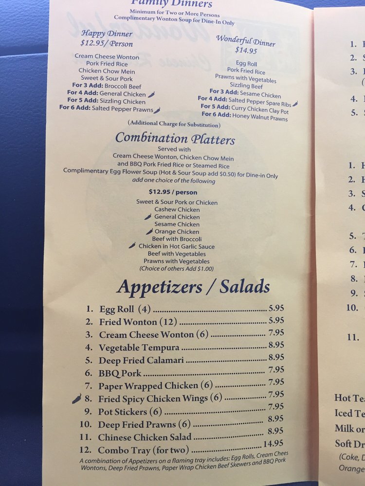 Introducing the menu at Wonderful Chinese Restaurant, located in Placerville, CA, offers a wide range of appetizers, soups, and seafood dishes. From Egg Rolls to Hot & Sour Soup, there is something for everyone to enjoy. The Honey Walnut Prawns and Salted Pepper Prawns are customer favorites, showcasing the restaurant's commitment to delicious flavors and fresh ingredients. Customers rave about the friendly service and consistent quality of the food, making it a go-to spot for authentic Chinese cuisine. Whether you're dining in or ordering takeout, Wonderful Chinese Restaurant provides a satisfying experience that leaves you coming back for more. With a cozy atmosphere and a menu that caters to all tastes, this restaurant truly lives up to its name as a wonderful dining destination in El Dorado County.